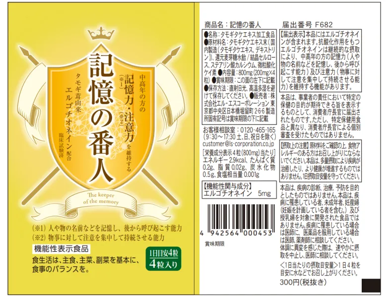जापान के एलएस कॉरपोरेशन द्वारा लॉन्च किया गया एर्गोथायोनीन सप्लीमेंट मध्यम आयु वर्ग और बुजुर्ग लोगों में स्मृति गिरावट को संबोधित करने के लिए डिज़ाइन किया गया उत्पाद है।
