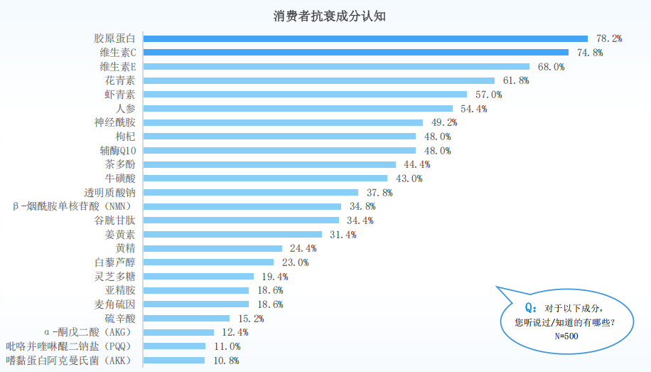 बाजार की शिक्षा और विकास के लिए धन्यवाद, कोलेजन वर्तमान में उपभोक्ताओं के बीच एक अत्यधिक मान्यता प्राप्त "एंटी-एजिंग घटक" है। मुख्यधारा के एंटी-एजिंग अवयवों की समझ पर सर्वेक्षण में, कोलेजन (78.2%), विटामिन सी (74.8%), और विटामिन ई (68%) शीर्ष तीन तत्व हैं जिन्हें उपभोक्ता मौखिक एंटी-एजिंग उत्पादों के लिए पहचानते हैं। विभिन्न आयु समूहों में शीर्ष 5 एंटी-एजिंग घटक धारणाओं में से, कोलेजन निस्संदेह "स्टार घटक" है।
